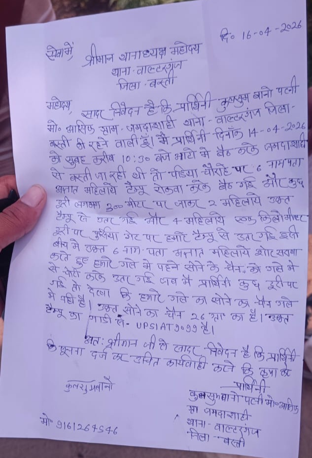 जनपद बस्ती के वाल्टरगंज थाना क्षेत्र में एक बार फिर लूट की घटना ने पुलिस व्यवस्था पर सवाल खड़े कर दिए हैं। जानकारी के अनुसार, जमदा शाही निवासी महिला कुलसुम बानो पत्नी ने वाल्टरगंज थानाध्यक्ष को एक लिखित शिकायत पत्र देकर घटना की जानकारी दी है।